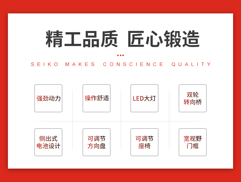 産品賣(mài)點 整車AC交流免維(wei)護 高性能蓄電池(chí) 雙輪結構轉向橋(qiáo) 多重舒适設計駕(jia)駛更輕松 LED大燈 寬(kuan)敞視🐪野門框 前橋(qiao)驅動