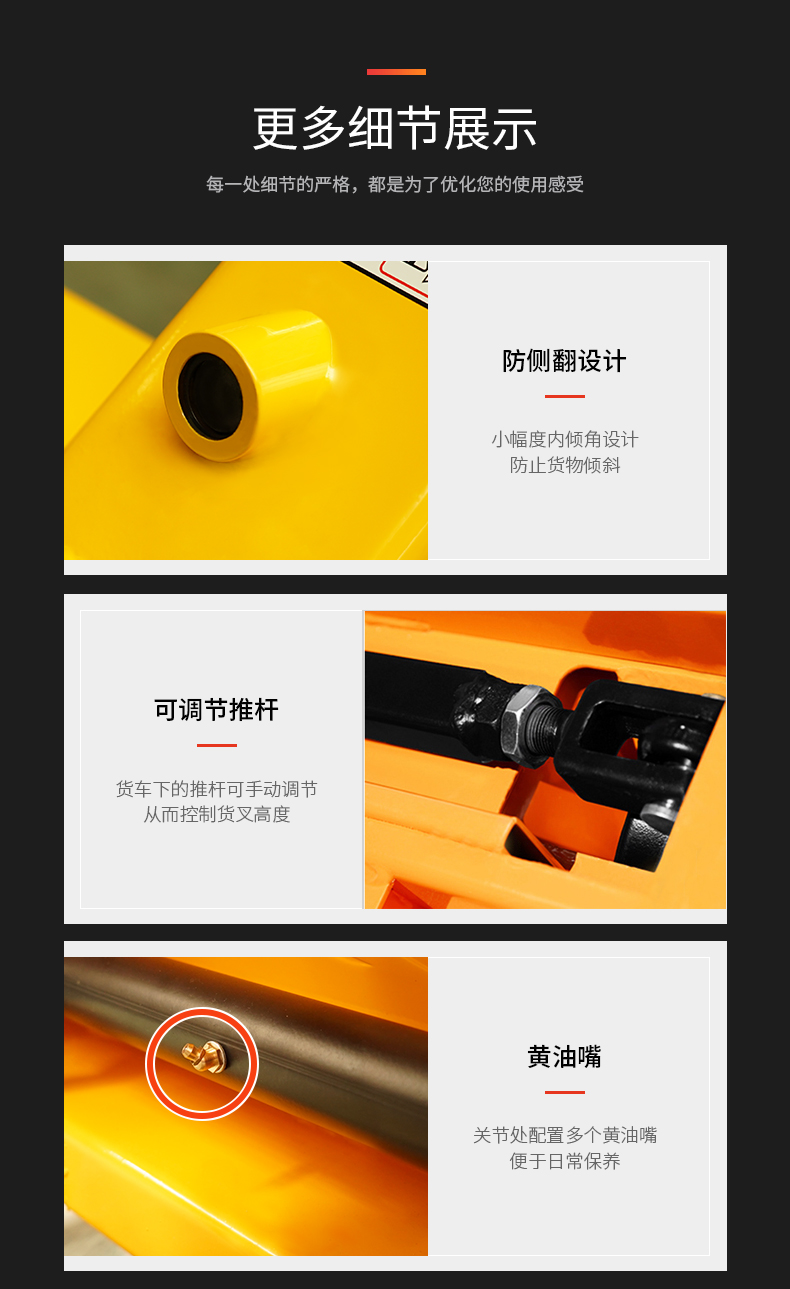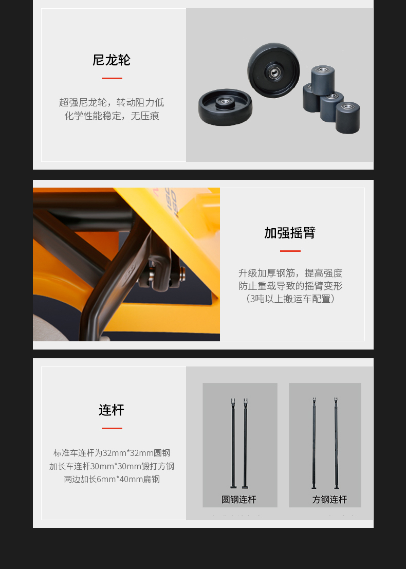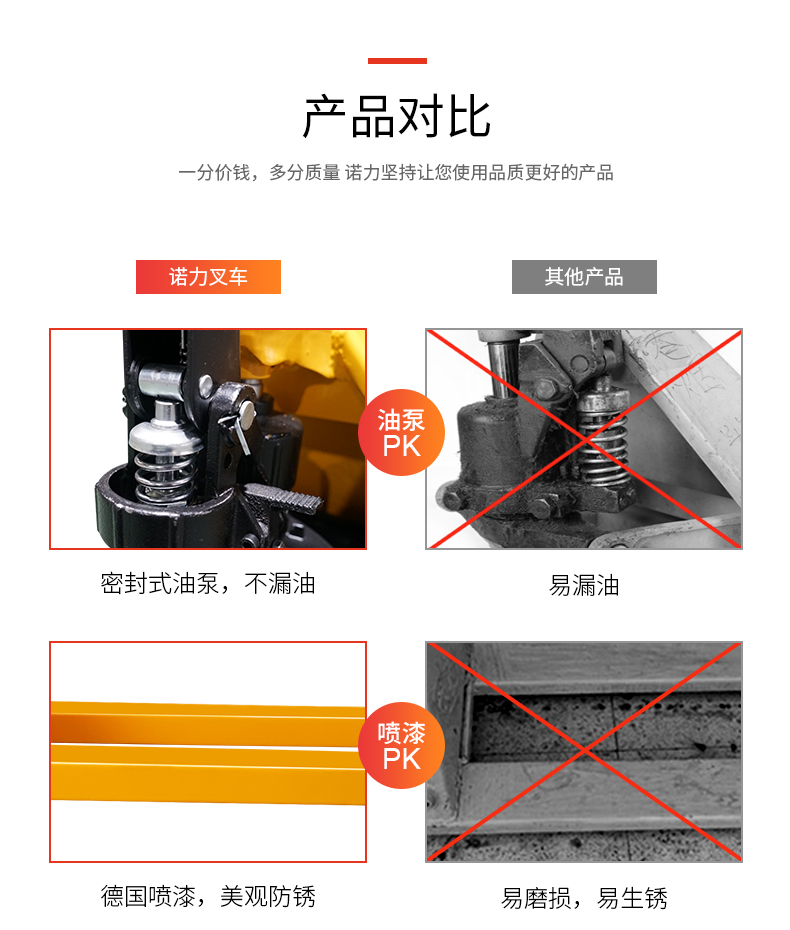 産品賣點(diǎn) 設計出衆(zhōng),品質的搬(ban)運車 是各(ge)種超市、倉(cang)庫和工廠(chǎng)段距離手(shǒu)動搬運貨(huo)物的理想(xiǎng)選擇材料(liao)選用加強(qiang)型剛才,堅(jiān)固耐♻️用,外(wài)形精緻美(měi)觀;德國标(biao)準WAGNER噴塗系(xì)統确♋保噴(pen)塗質量所(suo)有的轉向(xiang)軸處都加(jia)以潤滑,确(que)🐕保良好的(de)操作性和(he)🏃🏻輕松的轉(zhuan)向;複合套(tao)❓和鍍鉻軸(zhou)确😍保了安(ān)靜平穩的(de)起升和行(háng)走,延長使(shǐ)用壽命